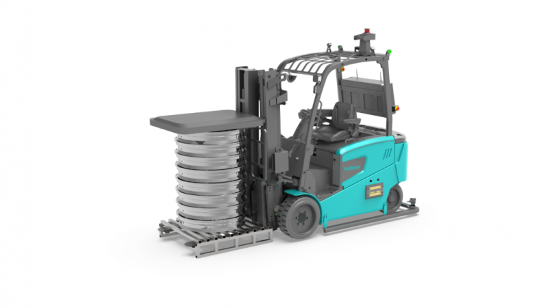 E系列平衡重式無人叉車配備串桿屬具,專為帶卷芯的卷料設計,可實現鋼片卷、鋼筋卷等卷料的無載具搬運,確保搬運過程精準穩定,提高生產效率