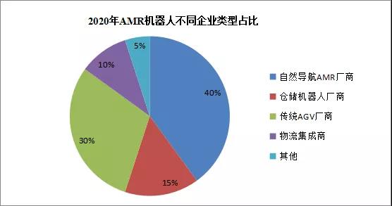 從企業(yè)數(shù)量上來看,目前AMR市場中,有40%是專注于這一細分領(lǐng)域的企業(yè),其次是傳統(tǒng)機器人廠商,占比30%,再是倉儲機器人廠商及物流集成商等。傳統(tǒng)AGV廠商和倉儲機器人企業(yè)對自然導(dǎo)航AGV/AMR市場頗為關(guān)注。