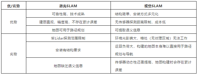 圖表4:激光SLAM和視覺SLAM優(yōu)劣勢對比